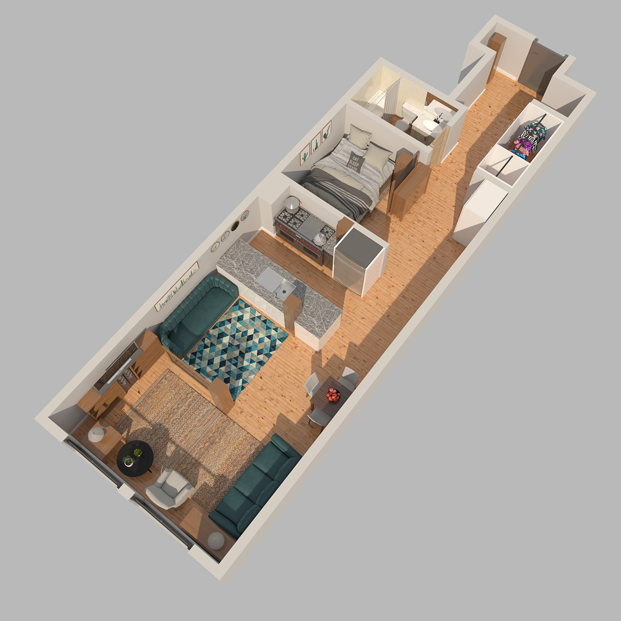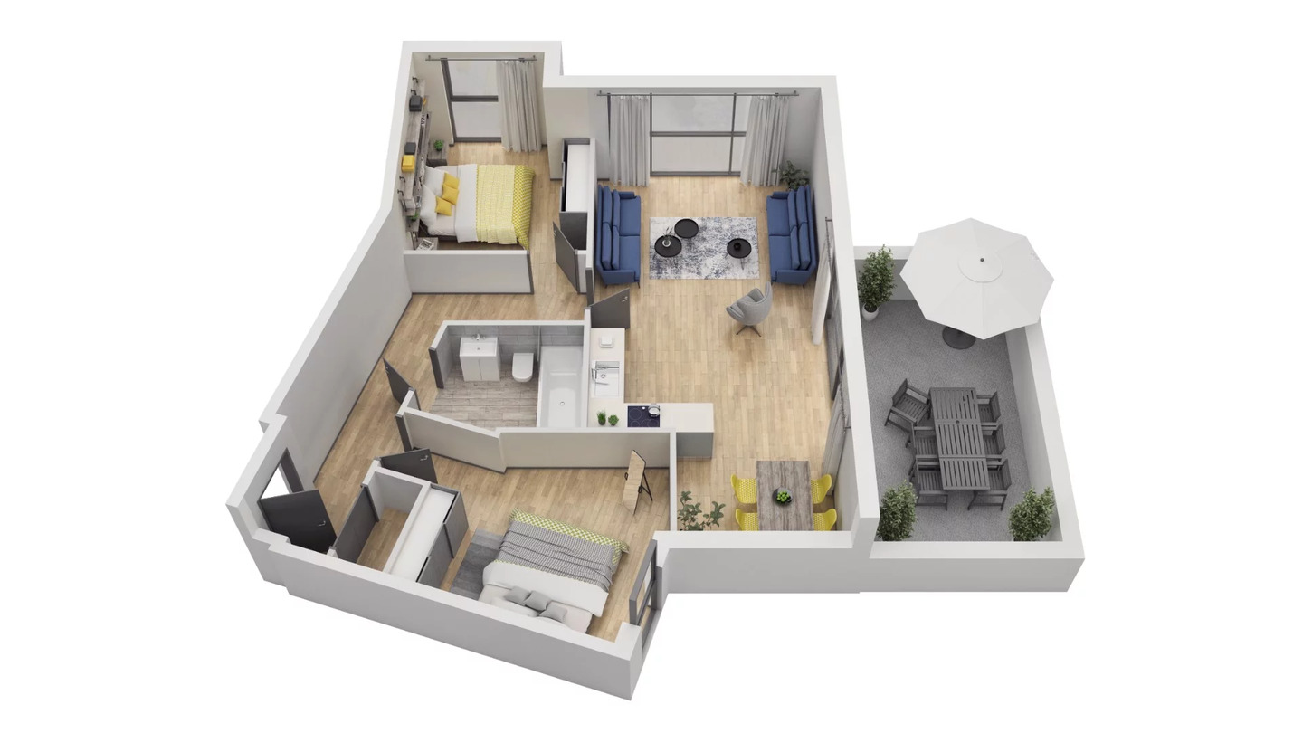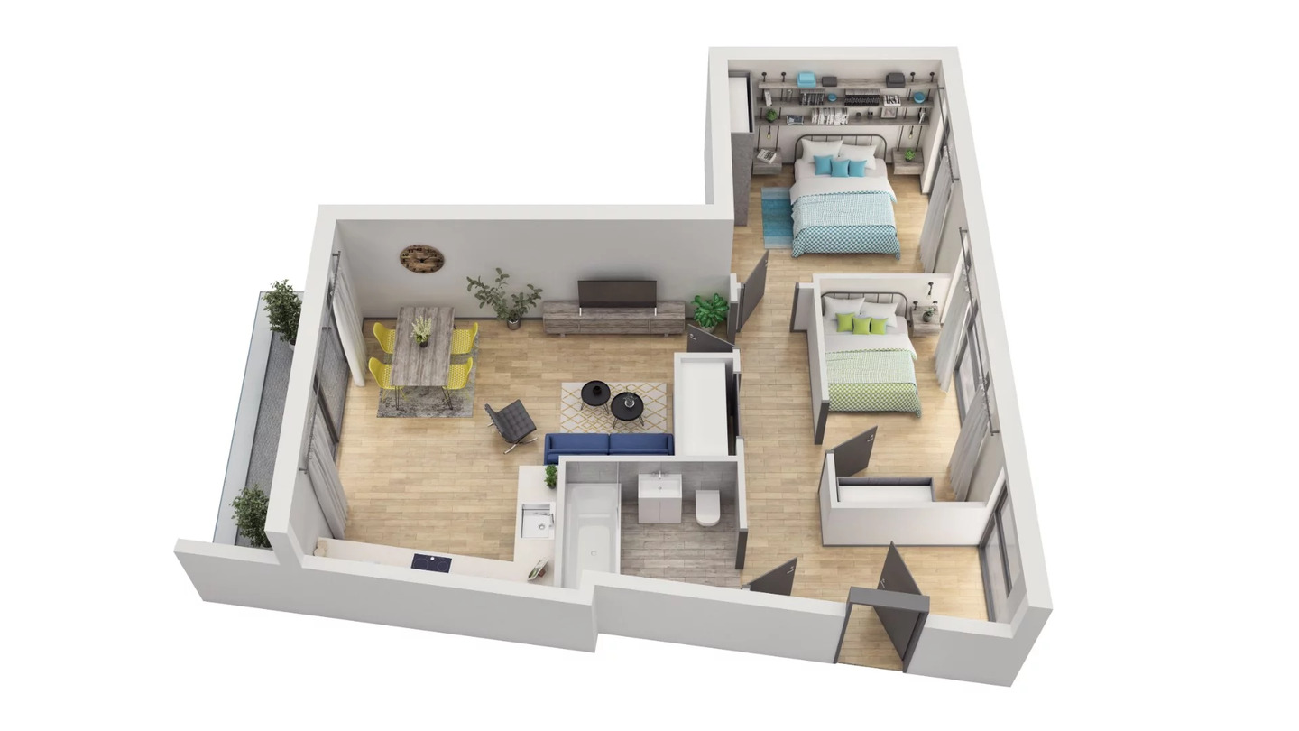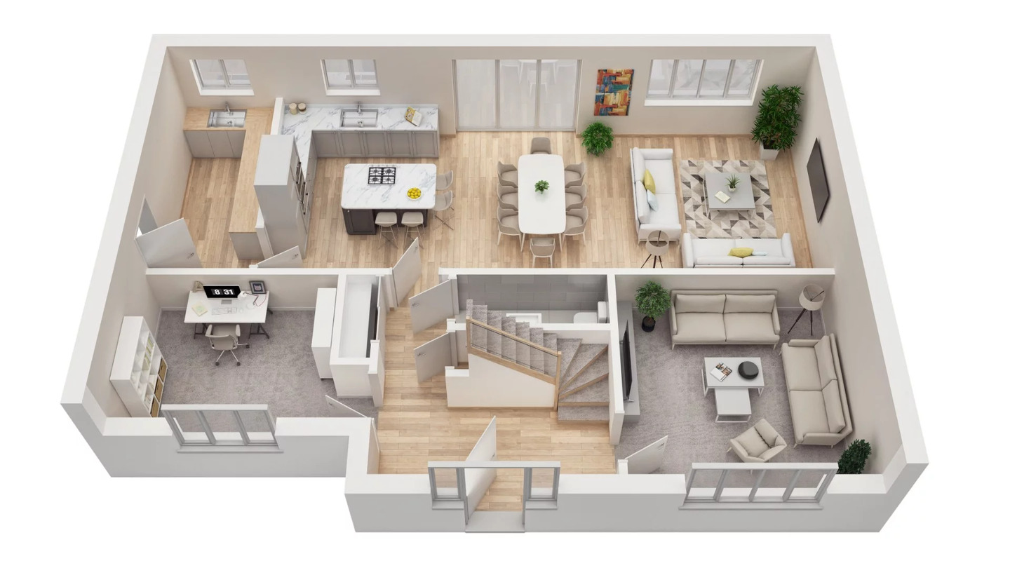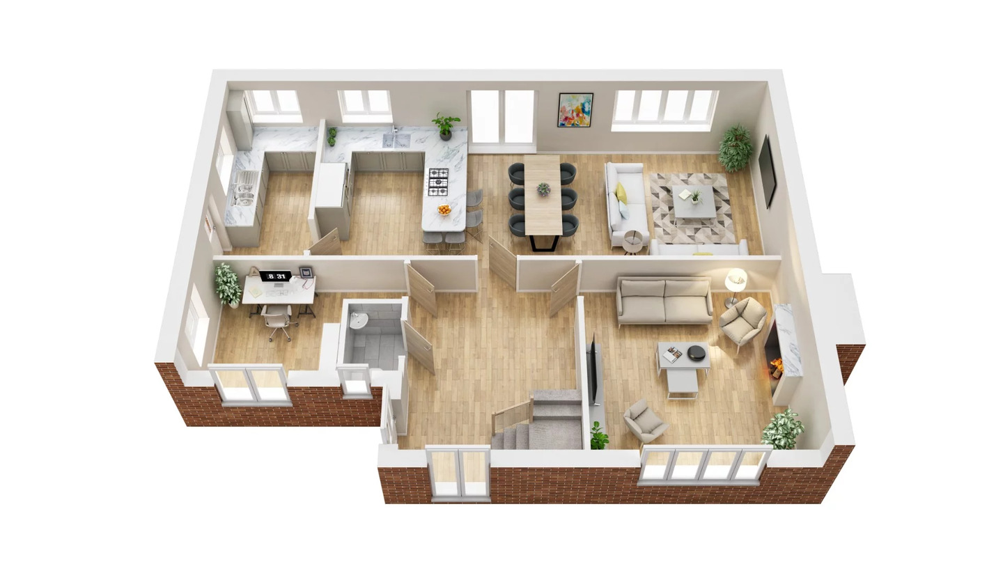 Three-dimensional floor plans give clients an intuitive bird’s-eye view of the space with realistic furnishings, material finishes, and natural lighting. These renders help buyers understand room proportions and flow in a way that traditional 2D plans cannot.