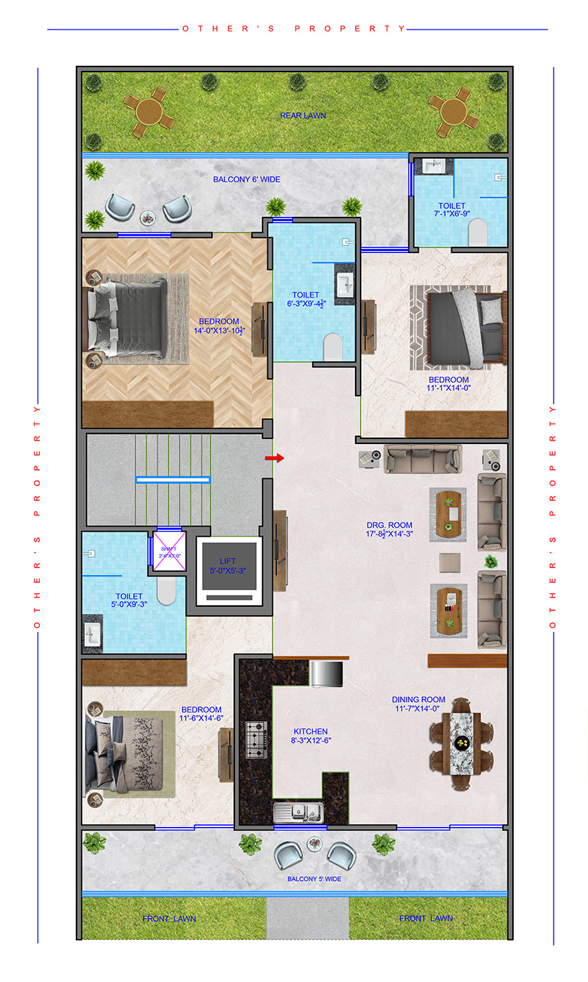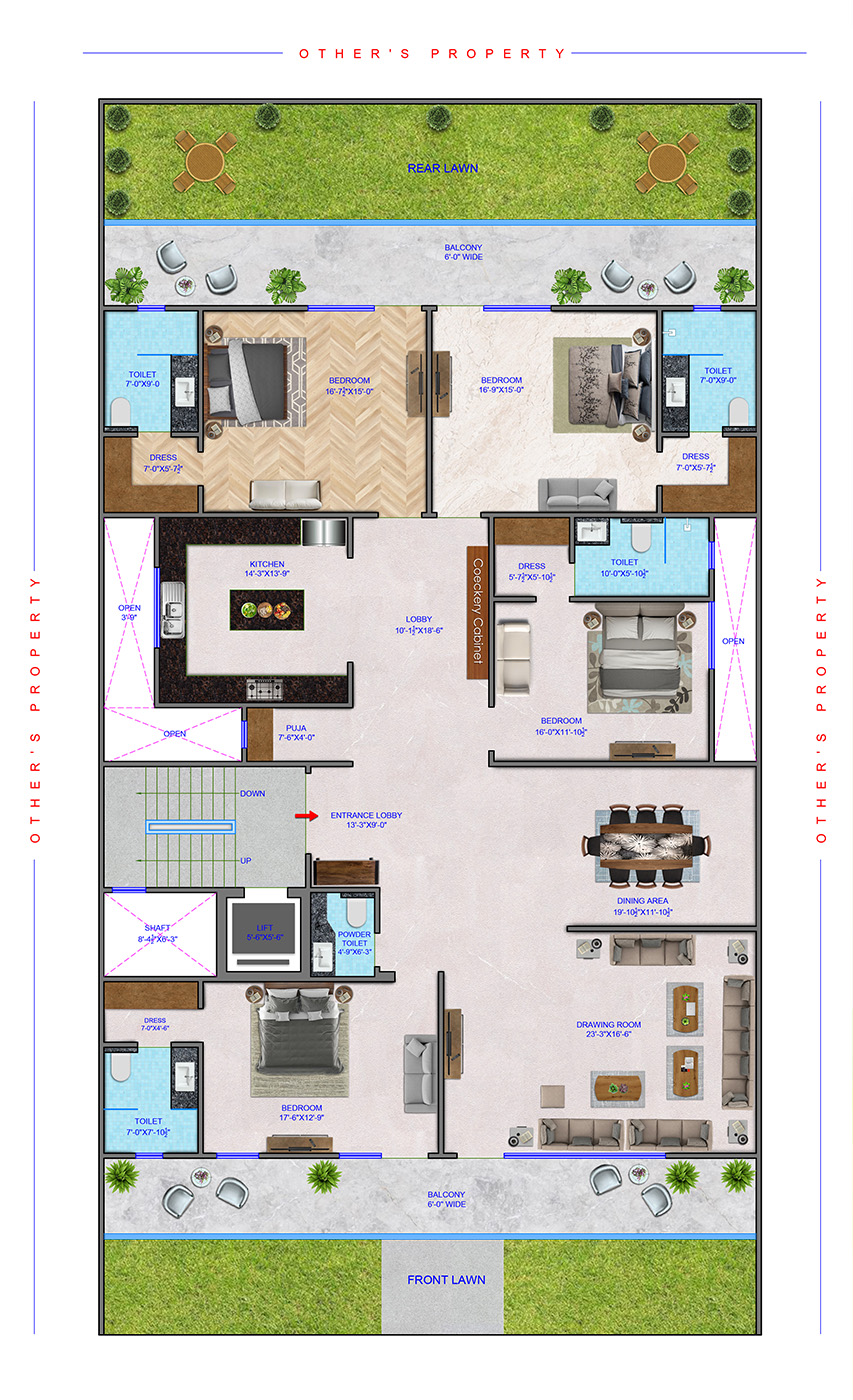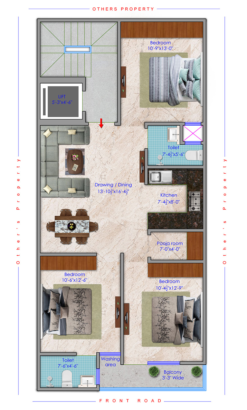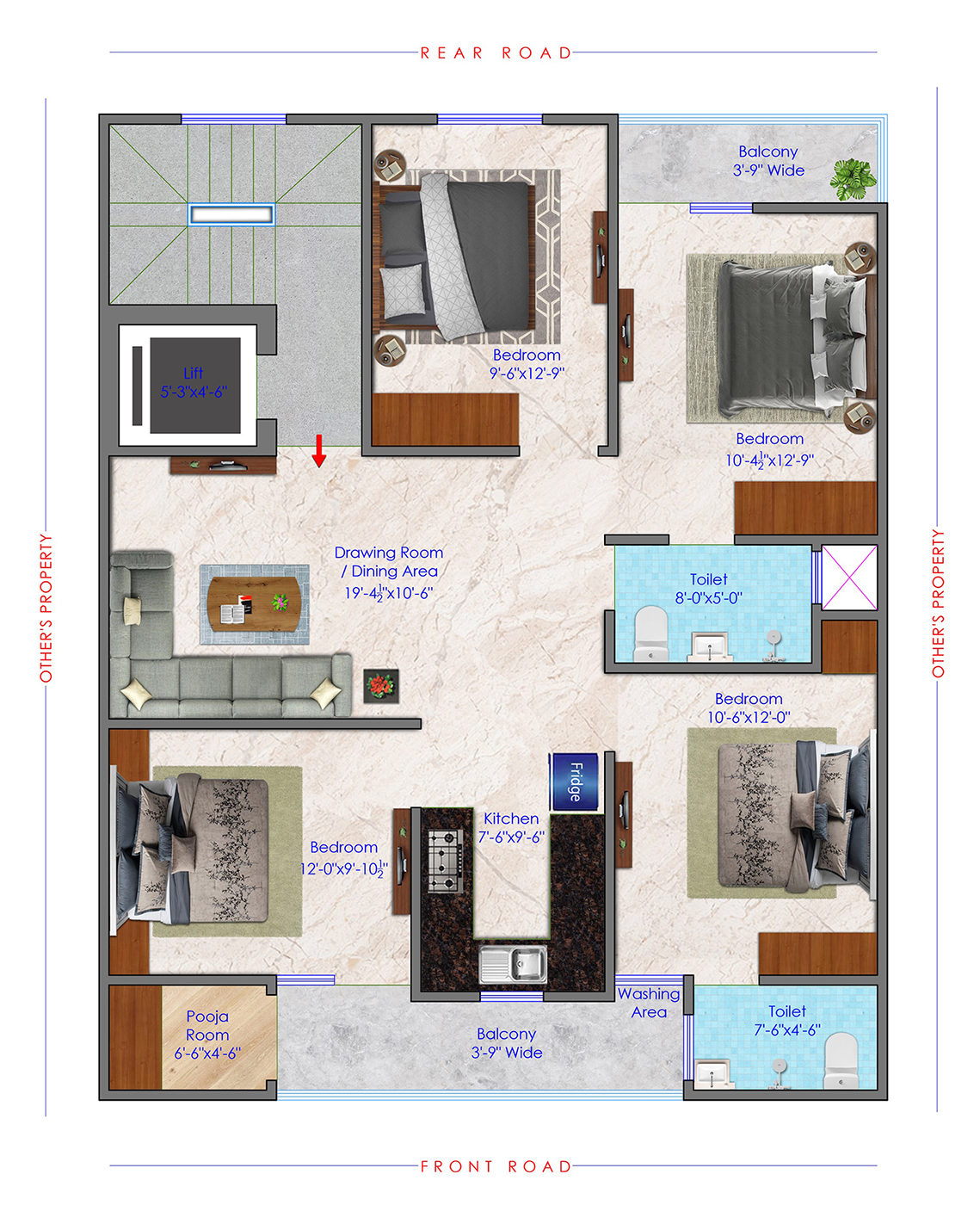 Three-dimensional floor plans give clients an intuitive bird’s-eye view of the space with realistic furnishings, material finishes, and natural lighting. These renders help buyers understand room proportions and flow in a way that traditional 2D plans cannot.